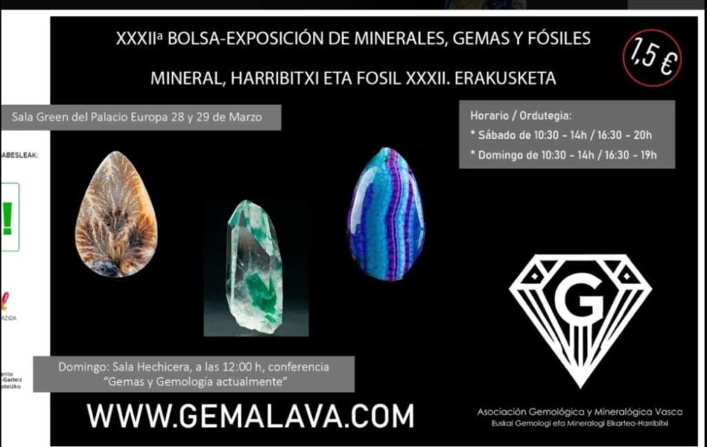 Las piedras estarán expuestas durante los días 28 y 29 de Marzo de 2026 en la XXXII-BOLSA-EXPOSICIÓN DE MINERAS, GEMAS Y FOSILES, de Vitoria Gasteiz, Sala Green del Palacio Europa.